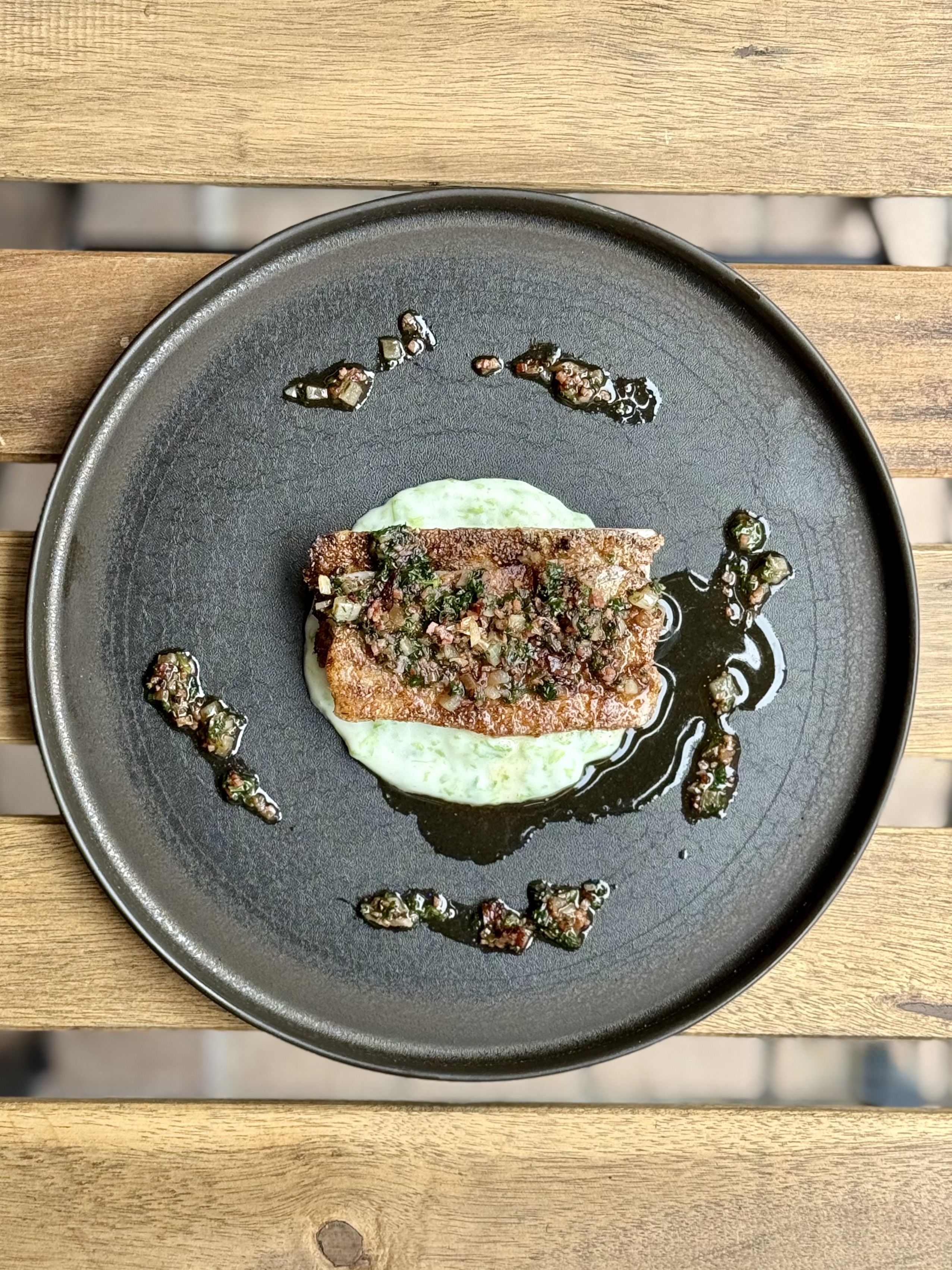 さっぱりとした太刀魚(旬の魚)をライ麦粉をつけて焼き上げ、コクのあるバターソースに合わせた一品、じゃがいもと岩海苔ののピューレを添えて